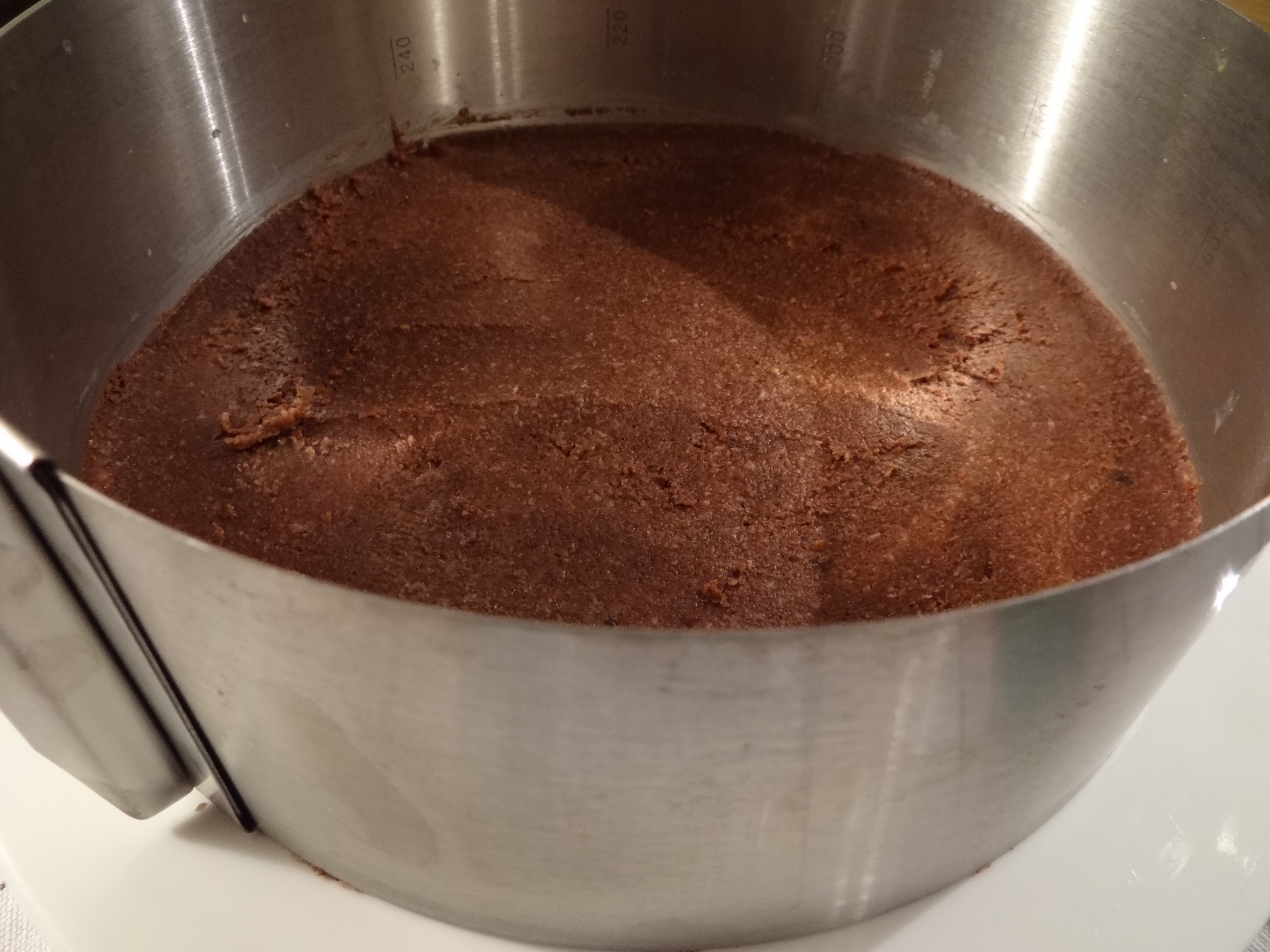 Dann habe ich den Teig auf eine Tortenplatte mit einem Tortenring (ø 24 cm) gegeben und den Teig mit einem Löffel plattgedrückt. Den Löffel dazu am besten immer wieder anfeuchten, denn der Teig klebt.