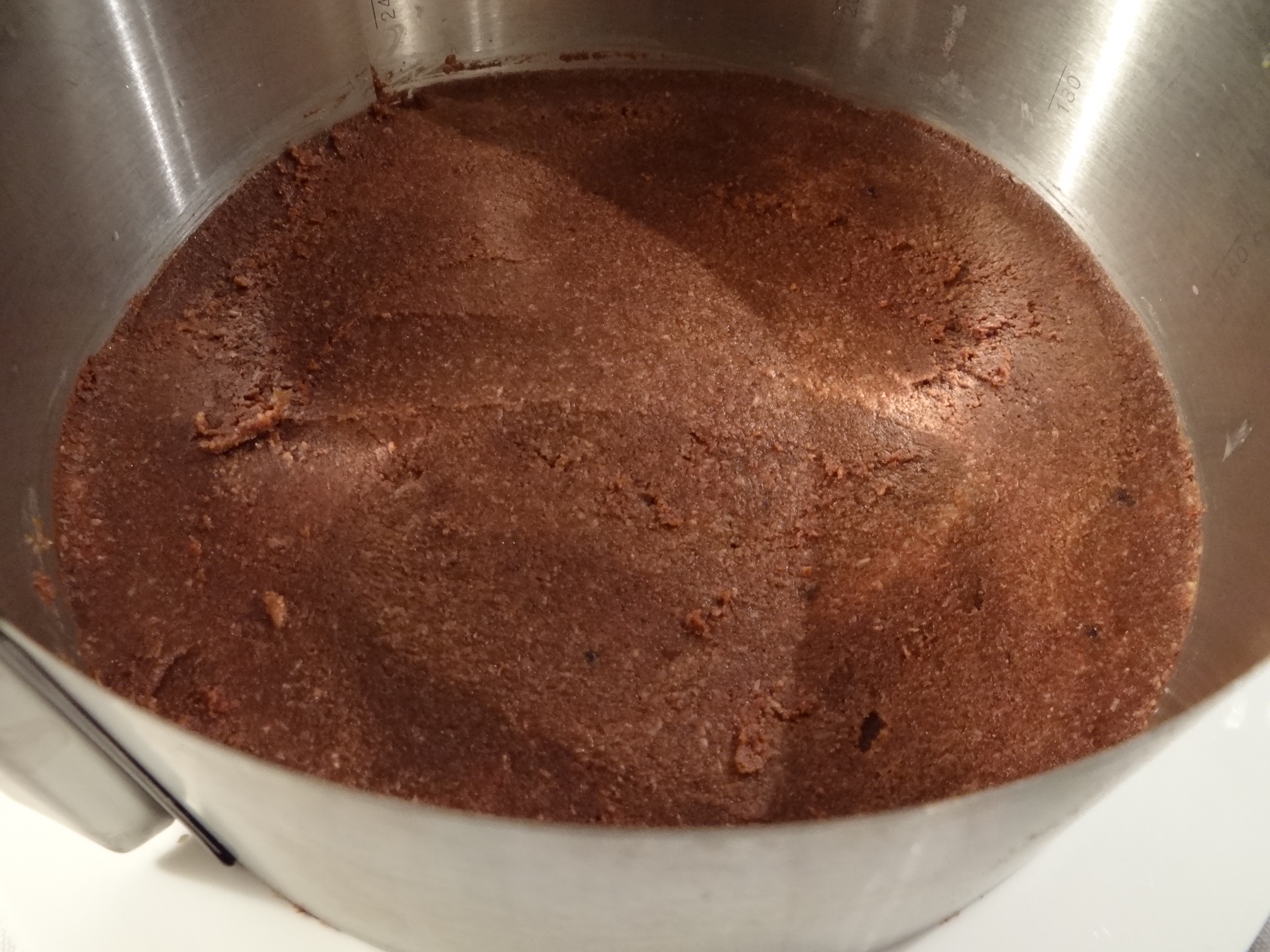 Die Datteln mit etwas Wasser im Mixer zu einer Dattelpaste pürieren. Du kannst vorher die Datteln einweichen, musst du aber nicht. Da ich die Torte im Akkord zubereitet habe, war keine Zeit zum Datteln einweichen. Dann gibst du die Kokosraspel und den Kakao zur Dattelpaste in den Mixer und mixt alles zu einem glatten Teig. Am besten nimmst du hier den Stopfer und drückst die Masse während des Mixens immer wieder runter.