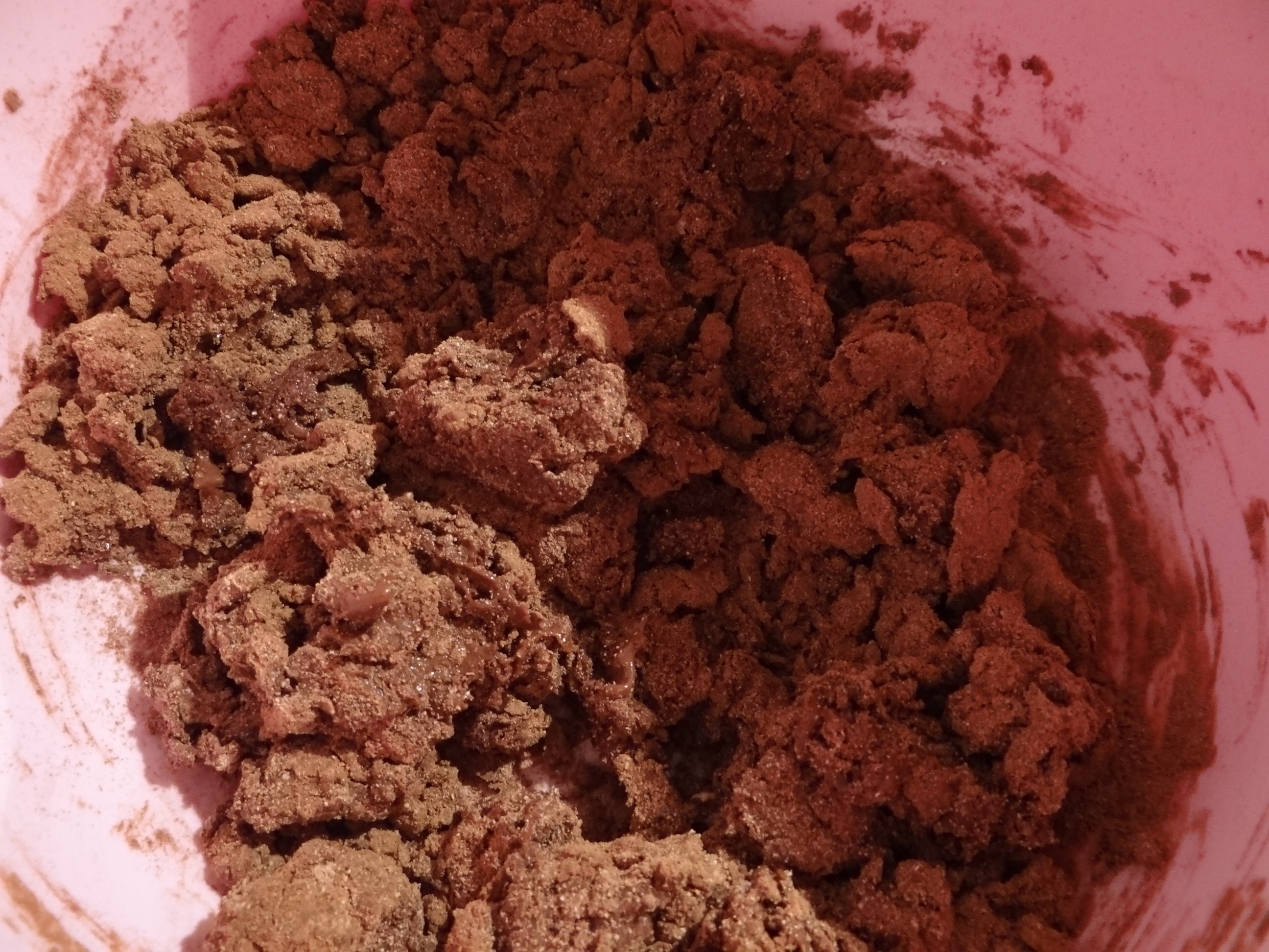 Alles mit einem Löffel vermengen, bis ein sehr klumpiger Streuselteig entstanden ist. Wenn er nicht klumpig genug sein sollte, dann gib einfach noch etwas mehr Kakao dazu.
