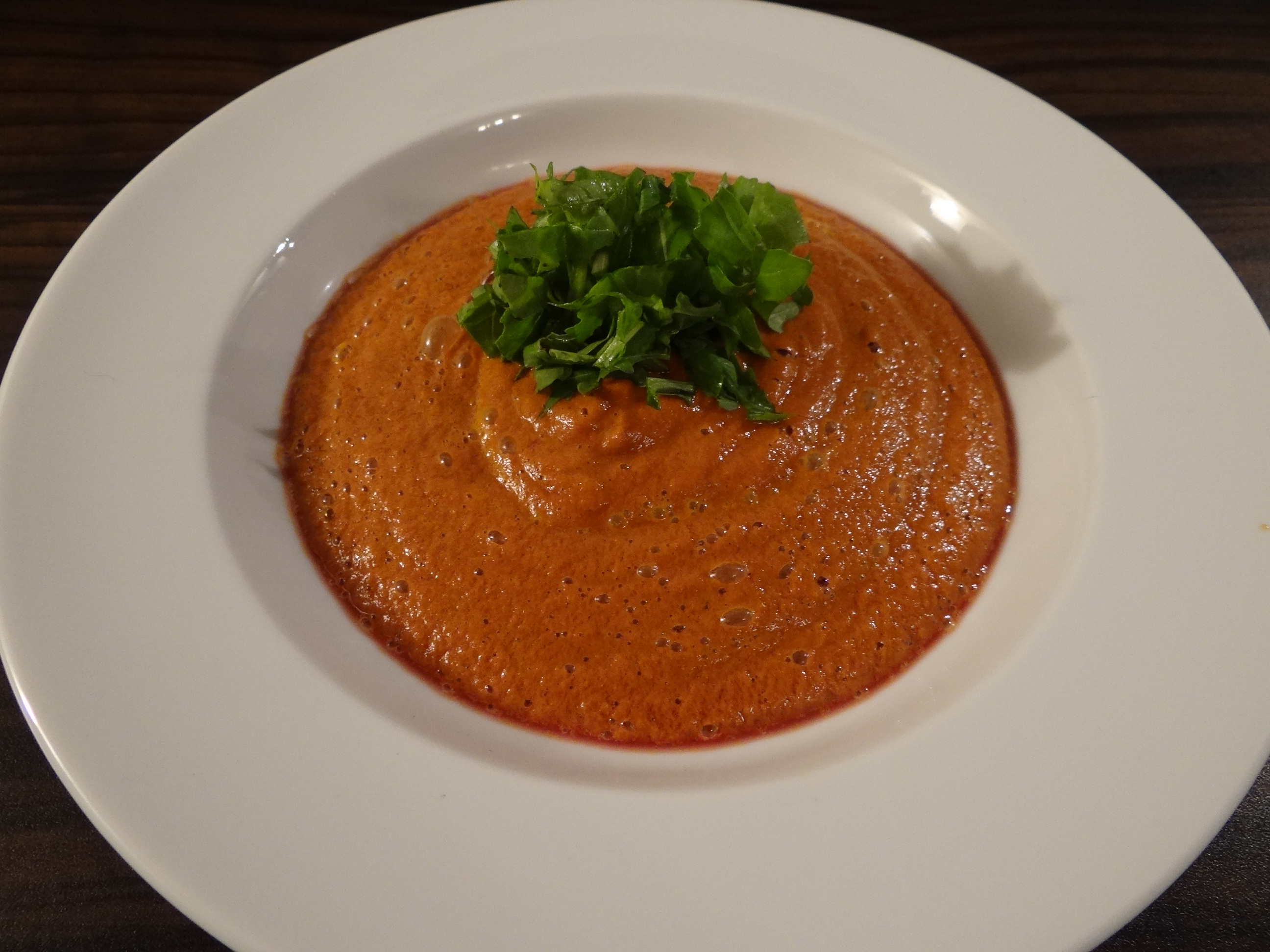 Das Tomatensüppchen anrichten und etwas Rucola obendrauf geben. Fertig.