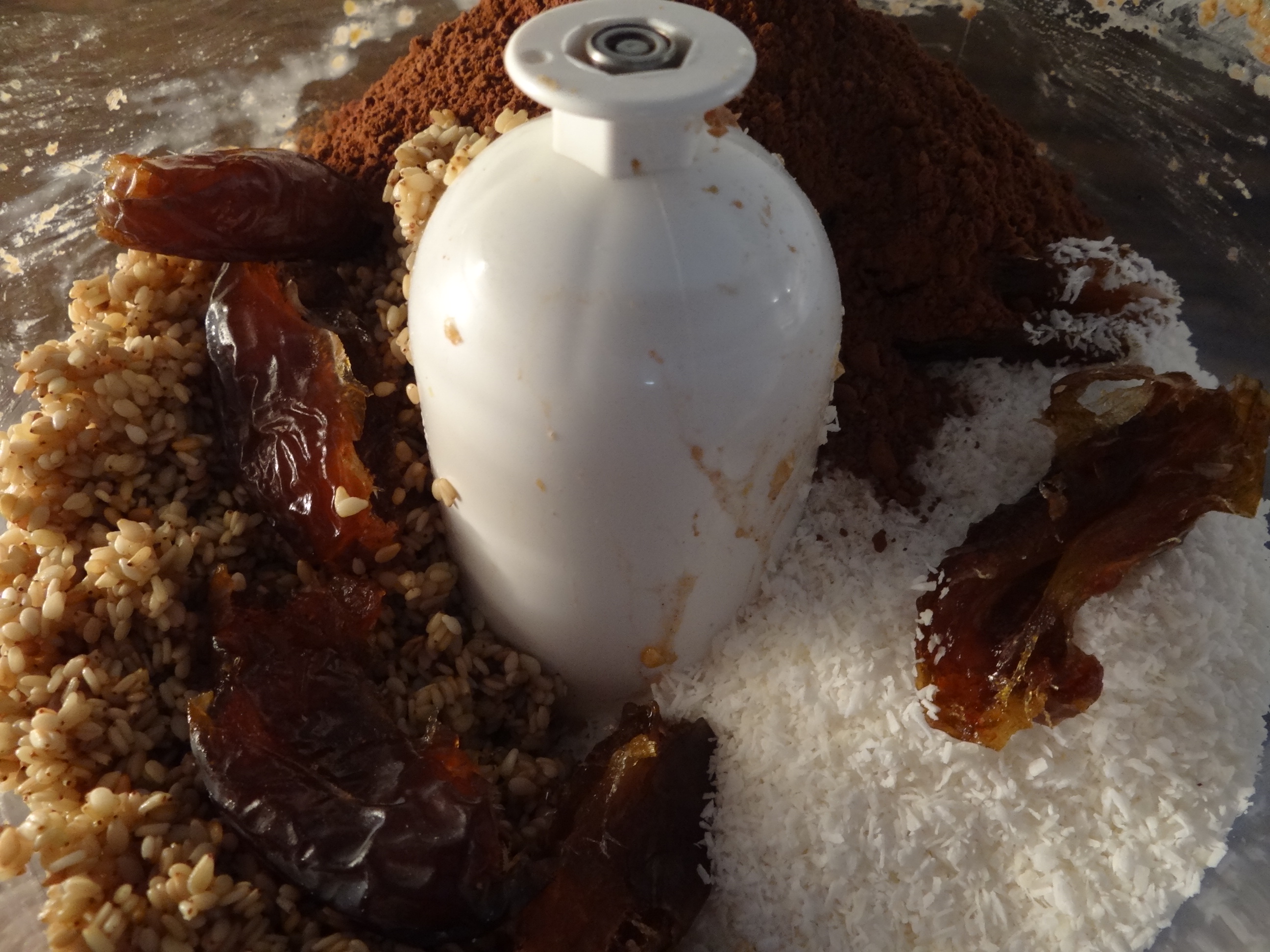Den Sesam und die Kokosraspel über Nacht einweichen. Dann am nächsten Tag alle Zutaten in die Küchenmaschine mit S-Messer geben, bis ein grober Teig entstanden ist. Wenn der Teig zu trocken sein sollte, dann kannst du noch etwas Wasser mit hinzu geben. Denn zum Dörren sollte der Teig gut streichfähig sein. Wenn dir der Teig nicht süß genug sein sollte bzw. du ihn gerne süßer haben möchtest, dann kannst du noch mehr Datteln dazugeben, Xylit oder Agavendicksaft.